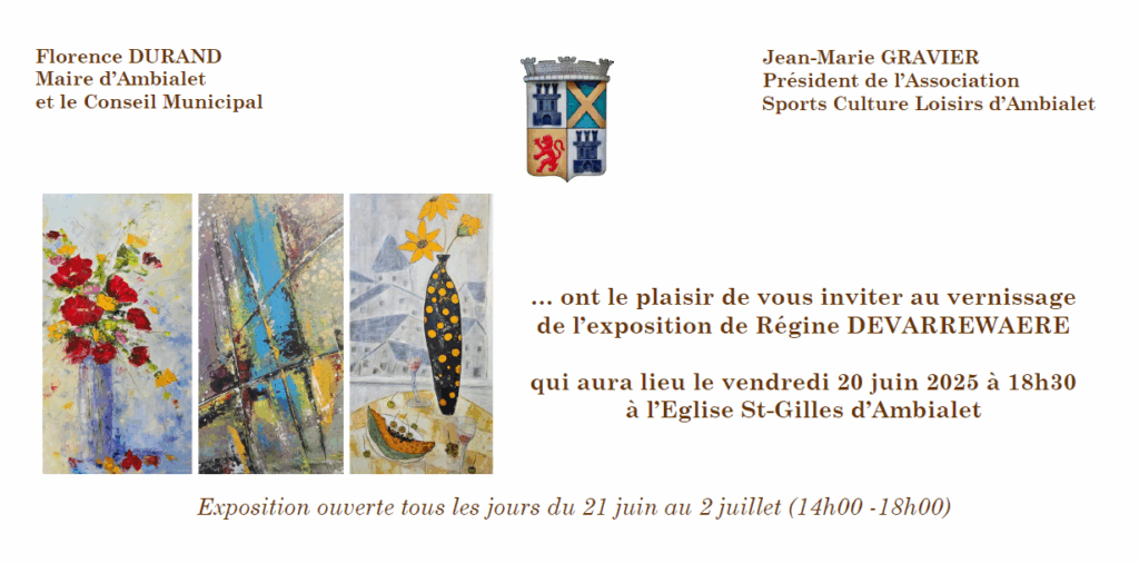 L’Association Sports Culture et Loisirs d’Ambialet vous invite à découvrir l’exposition présentée par Régine DEVARREWAERE, qui ouvre la saison 2025.