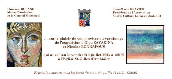 C’est une exposition « insolite et inédite » que l’Association Sport Culture et Loisirs d’Ambialet (ASCLA) vous invite à découvrir en l’église Saint Gilles d’Ambialet du 4 au 23 juillet 2025. Cette exposition est avant tout la concrétisation d’une improbable rencontre entre deux artistes ô combien différents, une iconographe, Olga ASTORG-ZAYAKINA et un peintre abstrait aux techniques mixtes, Nicolas BONNAFOUS.